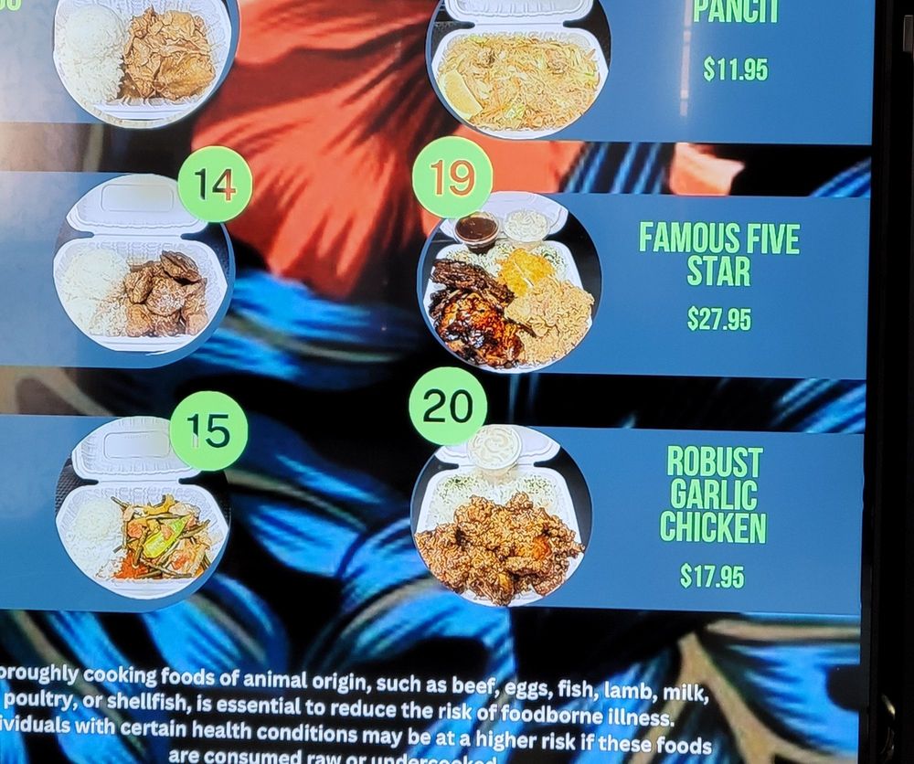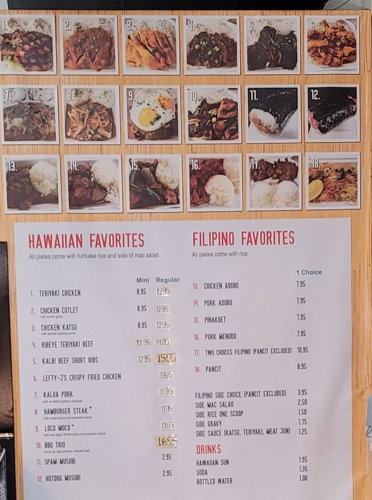 Bbq Chicken, Kalbi Beef Short Ribs, Teriyaki Beef, Chicken Katsu, Lefty-J's Crispy Fried Chicken, 3 scoops rice w/furikake, 1 scoop mac salad and 1 katsu sauce.